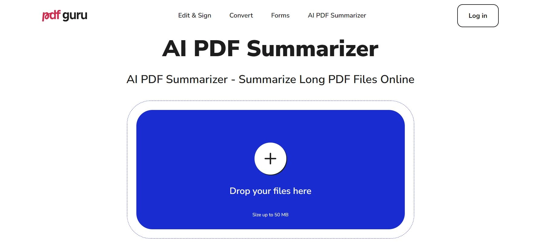 Друг сайт за обобщаване на PDF файлове, който желая да ти препоръчам, е PDF Guru. Това е напълно безплатна услуга, с лесен за използване интерфейс. Този инструмент поддържа почти всички езици, които се говорят по света, и е в състояние да генерира PDF резюмета без никакъв проблем. Като начало, отвори началната страница на програмата и добави PDF файла. Ако предпочиташ, можеш ръчно да избереш документа от твоя компютър, като щракнеш върху бутона +. Максималният допустим размер на всеки файл е 50 MB.
